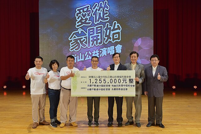 國慶日前愛心大爆發!永慶不動產、有巢氏房屋及台慶不動產中區經管會,持續投入「愛圓滿接力」公益行動,於10/6下午在中興大學聯合衡山基金會舉辦「『愛從家開始』衡山公益演唱會」,號召三品牌中彰雲投4縣市約200門市、3,000名夥伴支持公益,踴躍捐出善款認購公益演唱會門票,門票認購金額合計高達125.5萬元,除了將用於幫助衡山基金會修繕弱勢族群的居所,也將作為「衡山之家」的籌建經費,讓精神障礙者擁有安全、安心的環境來進行復健及治療;演唱會現場也進行捐贈儀式,由永慶慈善基金會董事林志雲代表捐贈,由衡山基金會董事長劉坤炳代表領受,同時,衡山基金會也回頒感謝狀表示感謝。