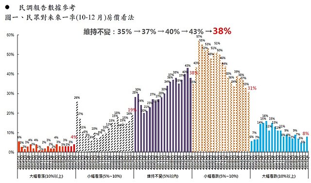 根據永慶房屋2019第四季網路會員調查,全台認為房價維持不變的比例,由上季的43%減少5個百分點至38%(圖一),連三季走升後首度下降,看漲與看跌同時上升,顯見消費者看法分歧,整體而言,房價仍呈現橫盤整理格局。永慶房屋業管部資深經理謝志傑分析:今年以來房市買氣回溫,讓房價獲得支撐,但第三季開始中美貿易摩擦升級,國際景氣不穩定加上總統大選影響,部份民眾看空房價;但近期台商回流,帶來資金及就業機會,加上利率仍處低檔,部分民眾看多房價,呈現意見分歧的現象。