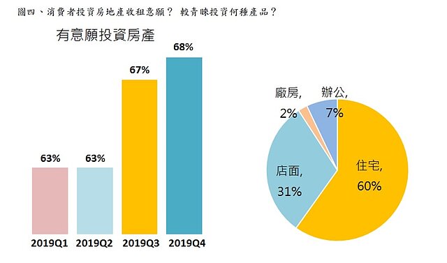 那麼消費者對於資金避險標的的選擇為何(圖三)?根據本次調查顯示,房地產再度打敗黃金、定存,成為消費者資金避險的首選,占比為35%,較上季調查增加一個百分點,同時也創下近五季來新高。房地產屬於耐久財的一種,除了保值與避險功能外,還具備投資效益,謝志傑說明,本次調查消費者是否有意願投資房地產收租(圖四),有高達68%消費者有意願,其中60%偏好投資住宅型產品,至於對投資報酬率的期待值,2%至3.5%區間的占比54%最高。