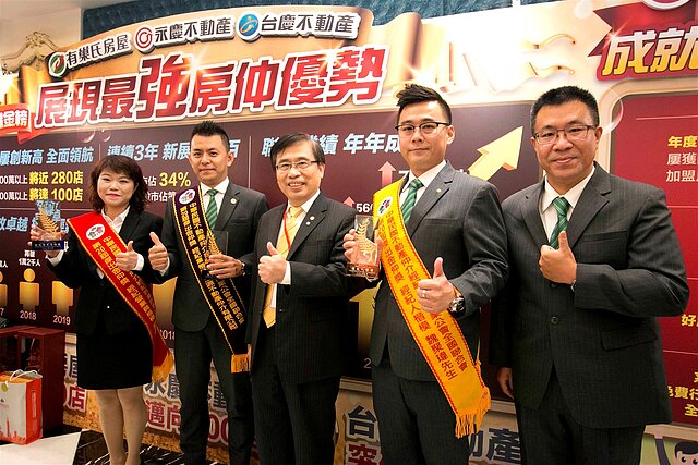 有巢氏房屋獲獎經紀人員與永慶房產集團加盟事業處董事長劉炳耀(中)合照
