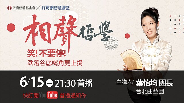 永慶公益線上講座於6月15日在好房網YouTube首播,邀請臺北曲藝團團長葉怡均分享《相聲哲學:笑! 不要停!-跌落谷底嘴角更上揚》