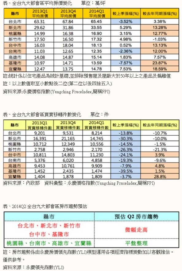 2014Q1 九大都會區量縮價仍穩 六大都會區價格年漲逾一成